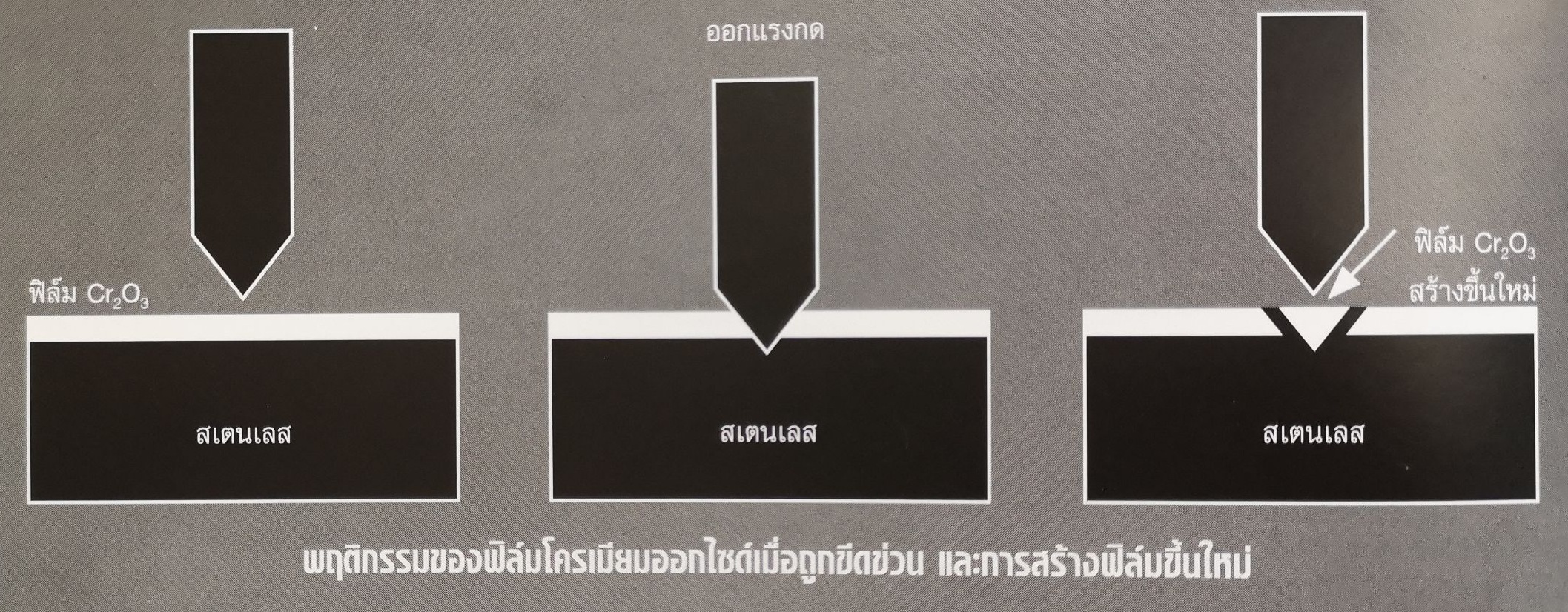 ดังนั้น ถึงแม้ว่าสเตนเลสจะถูกนำไปใช้งาน หรือถูกทำให้เกิดรอยขีดข่วนเกิดขึ้น มากเพียงใดก็ตาม ฟิล์มโครเมียมออกไซด์ นี้ก็จะสามารถซ่อมแซมตัวเองได้อย่างรวดเร็ว โดยการทำปฏิกิริยากับออกซิเจนในอากาศไปเรื่อยๆ เพื่อรักษาคุณสมบัติ ด้านการต้านทานต่อการกัดกร่อนเอาไว้ เราเรียกสภาพนี้ว่า Passivation พฤติกรรมดังกล่าวของสเตนเลสในรูปด้านล่าง